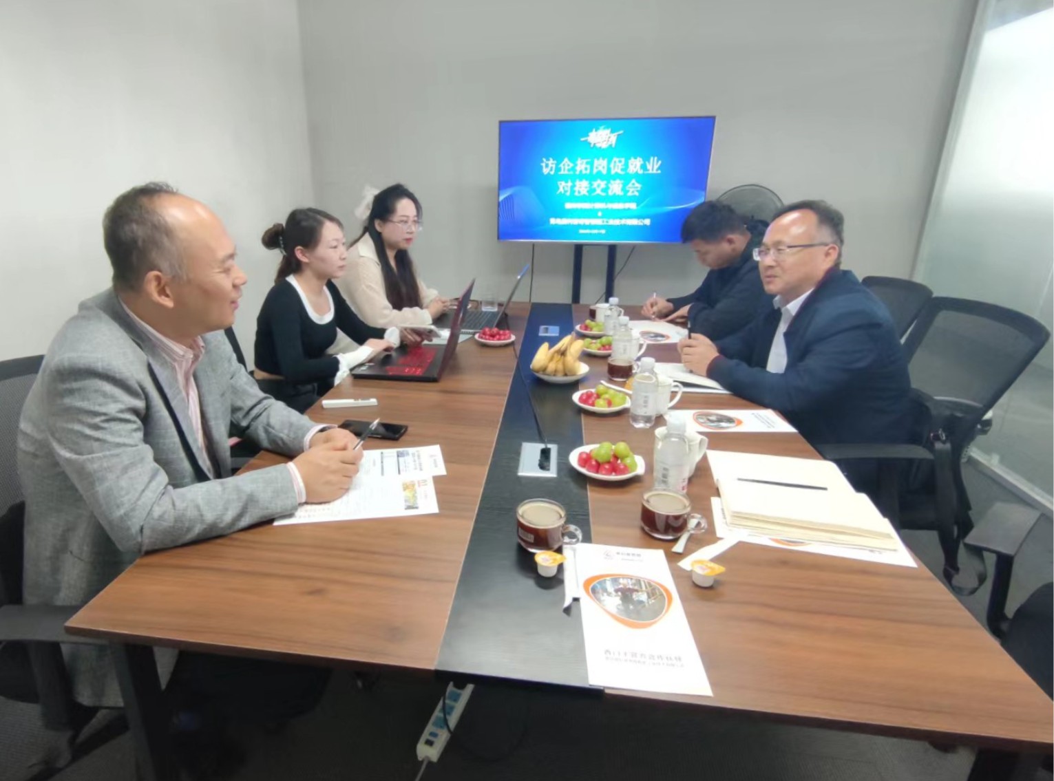 学院负责人与企业开展座谈交流,介绍学院学科专业设置、师资科研力量、人才培养模式等情况,分别对学生实习就业安排、项目合作进行了磋商。