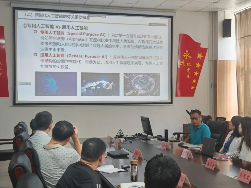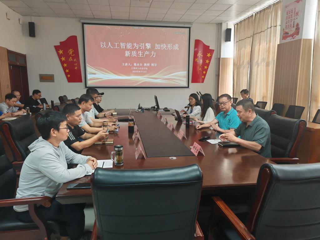 梁教授的报告围绕新时代人工智能的相关概念、新质生产力、人工智能助推新质生产力等三个方面,重点讲述了判别式AI、生成式AI,专业人工智能、通用人工智能,弱人工智能、强人工智能,语言、视觉、多模态等大模型,新质生产力的内涵,人工智能如何助推新质生产力、全面推进中国人工智能高质量发展。参会的教学人员针对我们开设的人工智能专业在教学过程中遇到的问题与梁教授进行了深入的探讨。