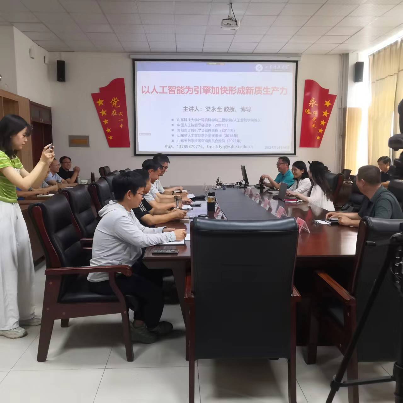 06月14日下午,beat365英国官方网站在明理楼0326会议室举办了教学研讨会议,会议邀请了山东科技大学计算机科学与工程学院院长、博士生导师梁永全教授,青软创新科技集团产业学院院长徐美姣。梁教授的报告题目为《以人工智能为引擎加快形成新质生产力》,beat365英国官方网站班子成员、师生代表及校企合作企业驻校教师参加了会议。