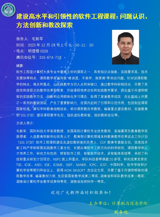 学术预告:建设高水平和引领性的软件工程课程:问题认识、方法创新和教改探索