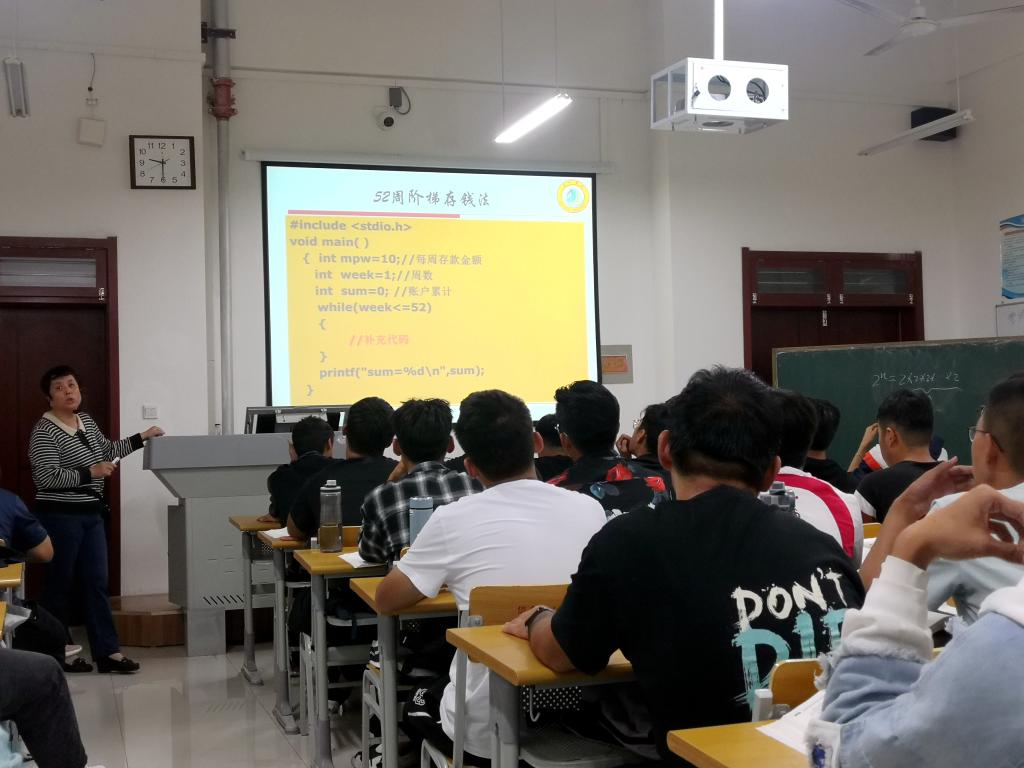 10月4日上午第2节,我院部分老师进入了宋秀芹老师的《程序设计基础》课堂进行观摩教学。课堂上,宋老师通过“珠峰高度”案例在讲授理论知识点的同时,契合实际的引入了老子的《道德经》中的“合抱之木,生于毫末;九层之台,起于累土;千里之行,始于足下。”,引导学生起点高低没有关系,怕的是不努力和不坚持,无论起点高低,只要肯努力和坚持,假以时日,终有所成;“52周阶梯式存钱法规则“案例引导学生在规划自己人生的最终目标时,把最终大目标分解成一个个小目标;最后,通过与该课程相关的蓝桥杯大赛的题目要求,告诫学生在学习过程中要始终保持认真、严谨的科学态度。