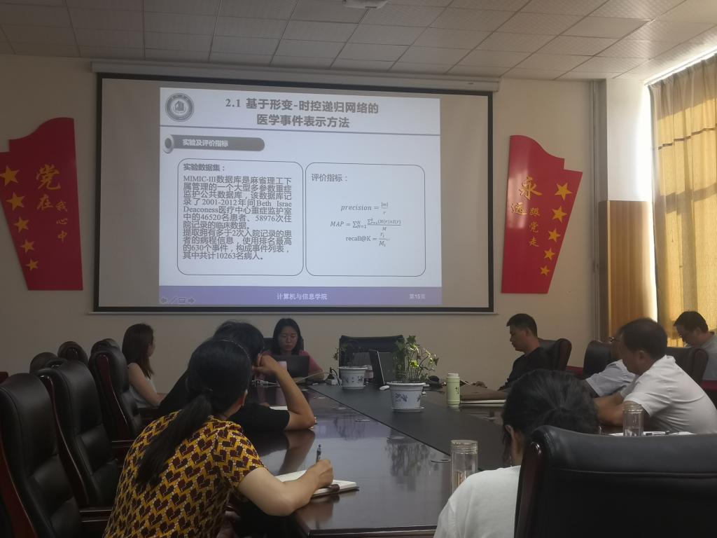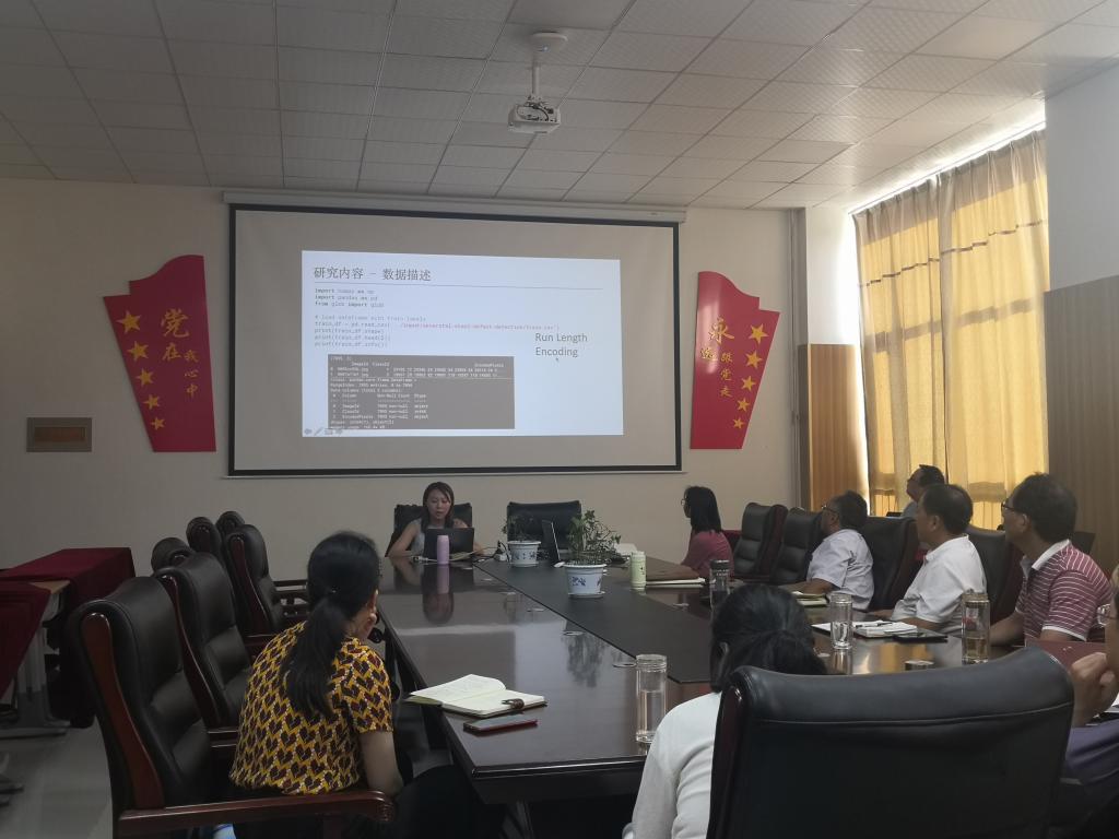 此次会议,赵丽丽老师做了题为《基于图挖掘的医学事件表示学习方法研究》的报告,针对患者在入院期间产生的一系列诊疗数据,利用人工智能技术对医学事件进行表示学习研究;扈钰老师做了《钢铁缺陷检测》的报告,介绍了使用图像二分类算法、图像分割算法完成缺陷检测、分割模型以及迁移学习在钢铁缺陷检测模型中的应用、结果对比及原因分析。参会的老师就报告中的人工智能领域中的知识应用进行详细的讨论。
