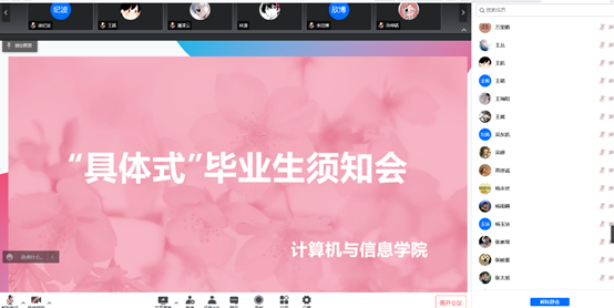 疫情防控期间,为确保全体师生的生命安全和身心健康,本次活动采取线上形式开展。活动开始,由辅导员老师向全体毕业生解读“具体式”毕业生须知会活动,帮助大家学校关于毕业生通知及政策等等,活动之后,为更好地了解同学们情况,辅导员老师们通过联系各班班长等班干部成员了解各班级毕业生动态,对有问题或有困难的同学采取电话访问的形式,了解毕业生的意向,为毕业生进行专业指导。