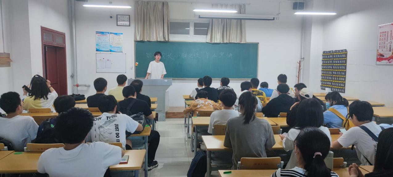 本次毕业生毕业宣讲会在教室里开展,请2022届毕业生进行演讲与沟通来表达自己对这大学四年的感想,叙述自己的成长变化。每位毕业生都发表了自己这大学四年的心得与体会,所有同学都认真倾听,并对此表示认同。之后,班长对各位同学们的感想进行了总结,此次活动圆满成功。