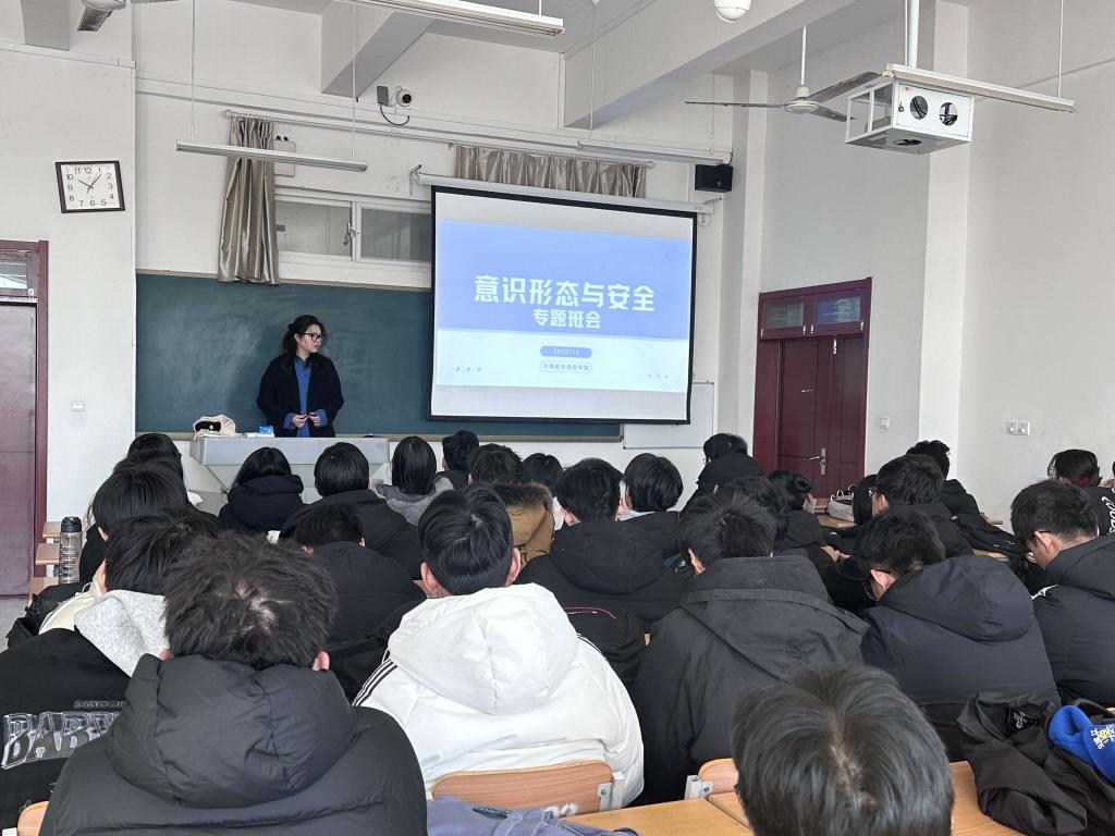 在班会上,辅导员从新时代意识形态教育的重要性、新时代大学生如何做好意识形态安全以及坚决抵制历史虚无主义等多个方面展开,通过案例引入、形象比喻、现场互动等多种形式进行主题宣讲,切实帮助同学们了解当前意识形态教育的重要内容,为同学们筑牢意识形态安全防线。另外,还讲到本科阶段的世界观、人生观、价值观关系到人格塑造和成长成型,事关高校“为谁培养”“为谁服务”的根本性问题。告诫同学们要关注时事政治,保持政治敏锐性,增强政治判断力、政治领悟力和政治执行力,始终在思想上政治上行动上同党中央保持高度一致。