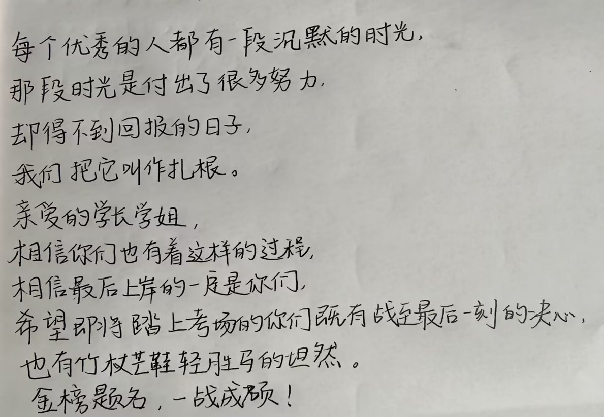 在活动过程中,学生们在线下准备祝福卡片,在上面写下自己的祝福和鼓励的话语,希望学长学姐们能够在接下来的考试中发挥出最好的水平。除了制作祝福卡片外,我院学生也在线上为学长学姐送上祝福,学生们纷纷在社交媒体平台上留言,为学长学姐们送上温馨的祝福和鼓励。学长学姐们表示感受到了学弟学妹们的关爱和支持,更加坚定了考研上岸的信心。同时,他们也表达接下来的考试中将会发挥出最好的水平,为自己负责,为学校争光。