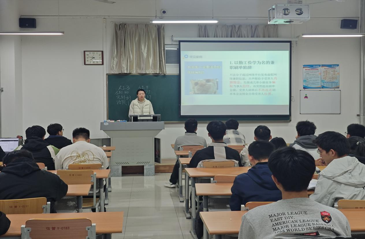 本次活动中,辅导员肖鸿霏聚焦演唱会门票诈骗、AI冒充亲友诈骗等大学生高发诈骗类型,结合真实案例拆解作案套路,重点警示“先交保证金”等诈骗诱饵,帮助学生认清诈骗核心特征。辅导员魏绪石传授“任何先交钱的都是诈骗”等防骗准则,通过PPT展示、案例剖析等形式,助力学生快速掌握防骗要点。 活动期间,学生认真聆听并记录、拍摄PPT留存指南,积极参与互动,有效填补了反诈知识盲区。