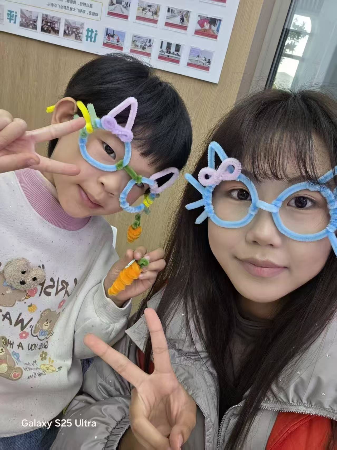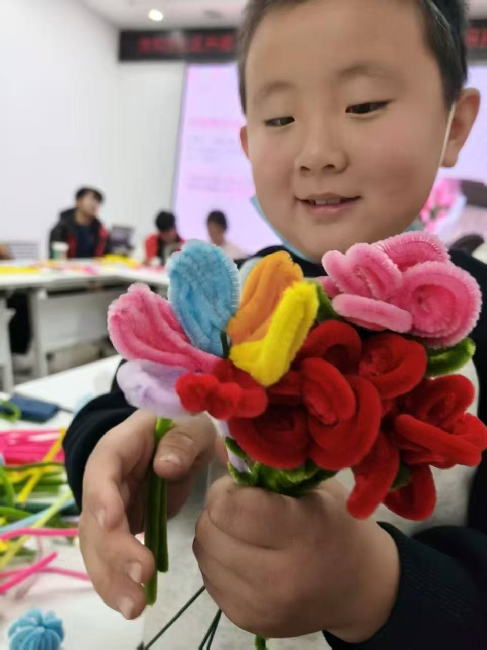 志愿者提前接受了专项培训,熟练掌握了扭扭棒制作技巧与儿童沟通方法。活动中,他们以“一对一”模式耐心指导,从基础手法教起并启发创作灵感。孩子们专注创作,或编织康乃馨致敬母亲,或勾勒向日葵感恩师长,亦有不少人用创意搭配出独特花束。作品完成后,志愿者协助孩子们书写祝福卡片、引导其倾诉心声,助力孩子们实现从“接收爱”到“表达爱”的温暖蜕变。